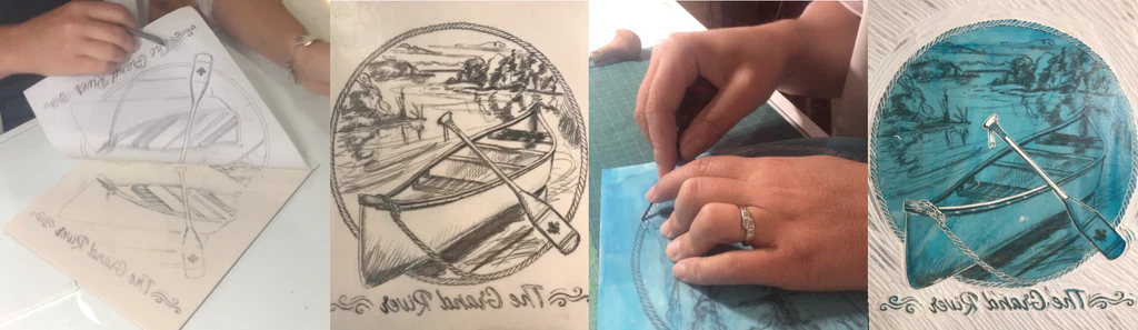 Process of pulling a 4 colour print from multiple blocks to create the Grand River Artwork by artist and printmaker Kristine MacGregor